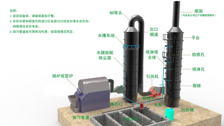 2.水膜除尘器按一节一米制作,现场吊装。按设备编号1、2、3、4、5、6等依次由下而上对称平齐安装。即编号1放