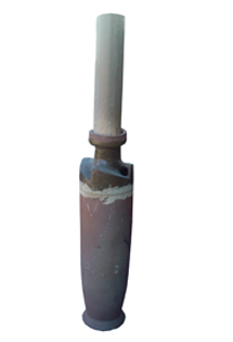 其特征是使之旋风分离段成为整体不漏风结构,从而有效克服了多段式结构易造成漏风、影响除尘效率的缺陷,以及在旋风管底部采用喇叭座裙和锥型插入头结构,更方便与底部集灰斗连接。喇叭裙周面不穿透排气孔,使得陶瓷旋风除尘管在烧成时,可有效防止开裂,提高了生产成品率。旋风分离段的中心排气管、进口旋风体和旋风分离锥筒制成一体,并使中心排气管超出进风平面,其顶端设有加接用喇叭接口,这样陶瓷旋风除尘管至少在旋风分离段具有整体无接口结构,可有效避免接口处可能发生的漏风、及对接造成的内壁不光滑,确保旋风分离效果。