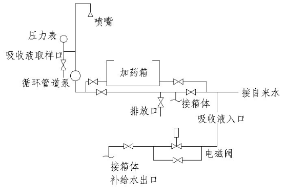 2.加药:吸收剂的加入应在吸收剂循环过程中进行,将吸收剂在加药箱调制完成后,关进口阀门,开出口阀门,药液即由循环泵加入箱体。定期由取样口取吸收液检测PH值,低于8时必须及时加药。自动加药经一次设定,定期检查即可。