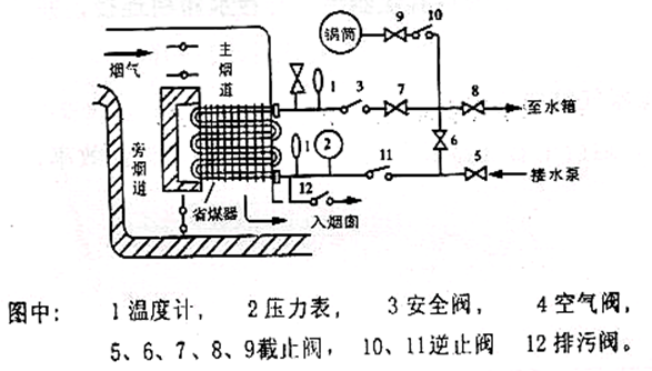 2.在无旁通烟道的情况下,省煤器出口应与水箱相连,以便在锅炉升火时,省煤器中的水,经加热后由出口又流入